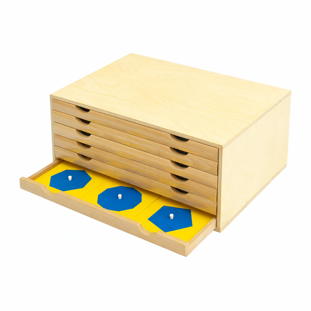 The Geometric Cabinet helps to form a foundation for geometry, it improves visual and tactile senses, prehensile grip, writing skills, and hand eye coordination; it also helps the child improve concentration, coordination, independence, and problem solving skills. The geometric cabinet with 6 drawers containing 35 geometric insets and frames: 6 circles, 6 rectangles, 7 triangles, 6 regular polygons, 4 curvilinear figures, 6 quadrilaterals and 1 blank frame.