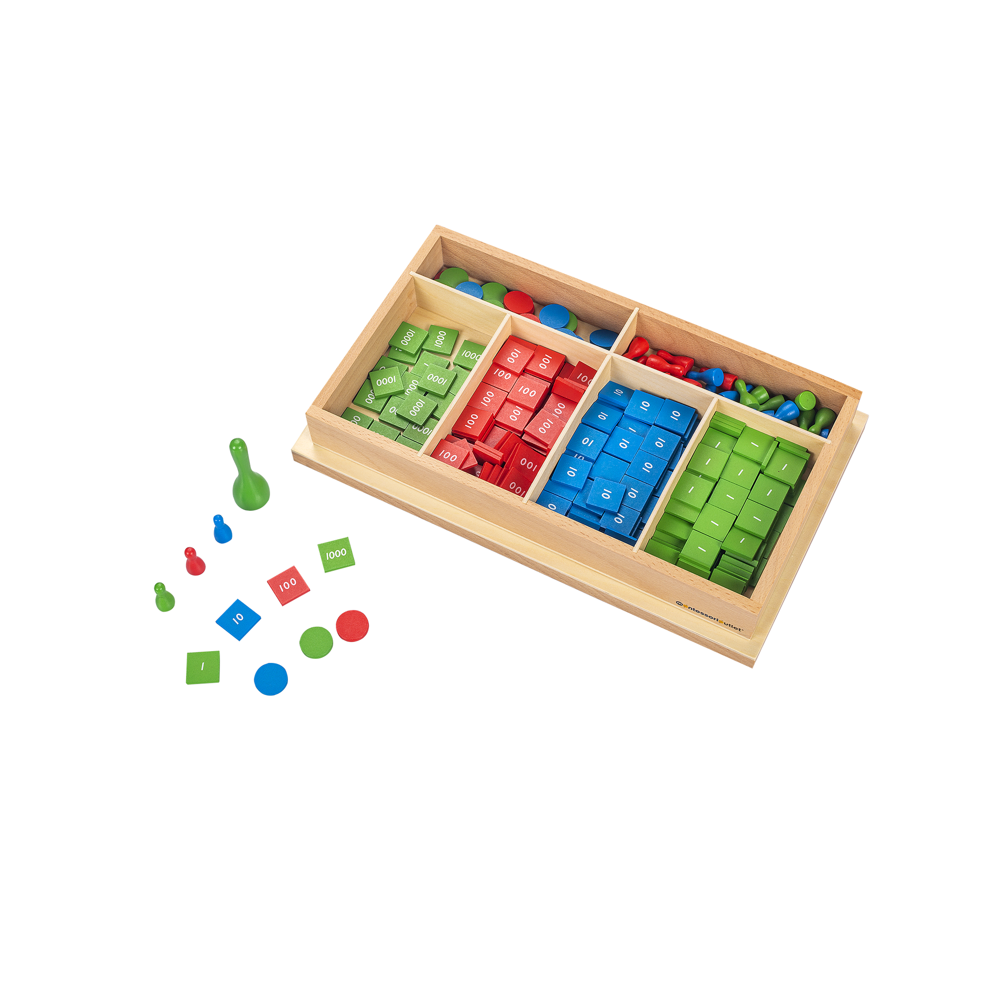The Stamp Game helps a child transition from a concrete understanding to a more abstract understanding of the decimal system, and introduces addition, subtraction, multiplication, and division of thousand numbers. Wooden box with six compartments containing green, blue and red wooden tiles labeled with 1, 10, 100 and 1000 and wooden skittles and counters.