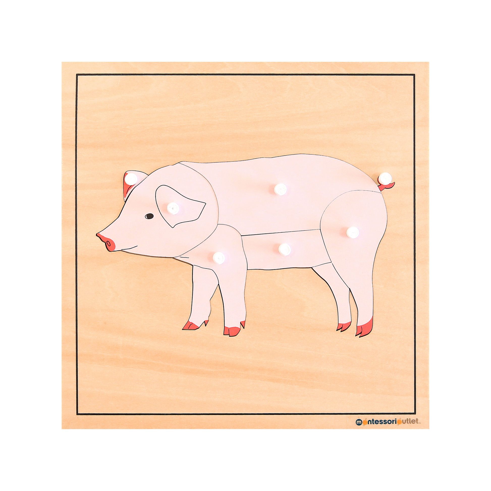 The Land Animal Puzzles are used to separate and identify different parts of the cat, dog, pig, hippopotamus, and koala. They are also used to show how each of the animals are the same and how they are different, and can be used to introduce animal classes. Pig puzzle made of Baltic Birch Plywood measuring 24cm x 24cm.