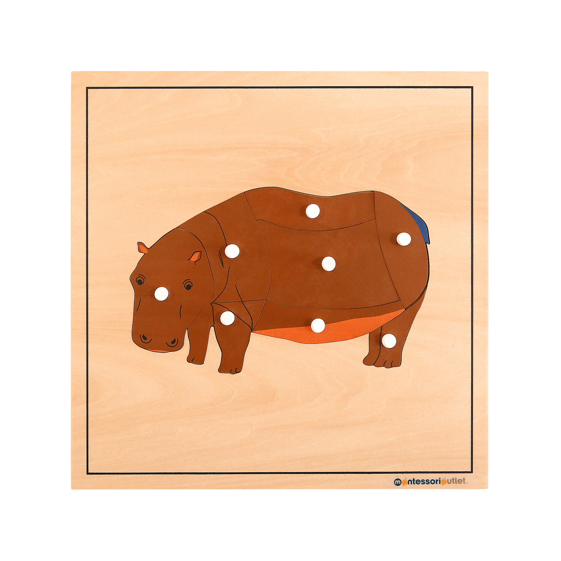 The Land Animal Puzzles are used to separate and identify different parts of the cat, dog, pig, hippopotamus, and koala. They are also used to show how each of the animals are the same and how they are different, and can be used to introduce animal classes. Hippopotamus puzzle made of Baltic Birch Plywood measuring 24cm x 24cm.
