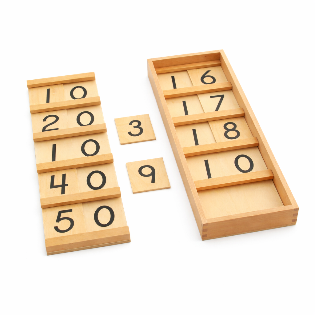 The Teen Board uses the knowledge of the bead stair to introduce the quantities and vocabulary of numbers 11-19. A wooden box with lid containing 2 teen boards (teaching 11-19) and 9 wooden cards with the numerals 1-9 printed in USA print.