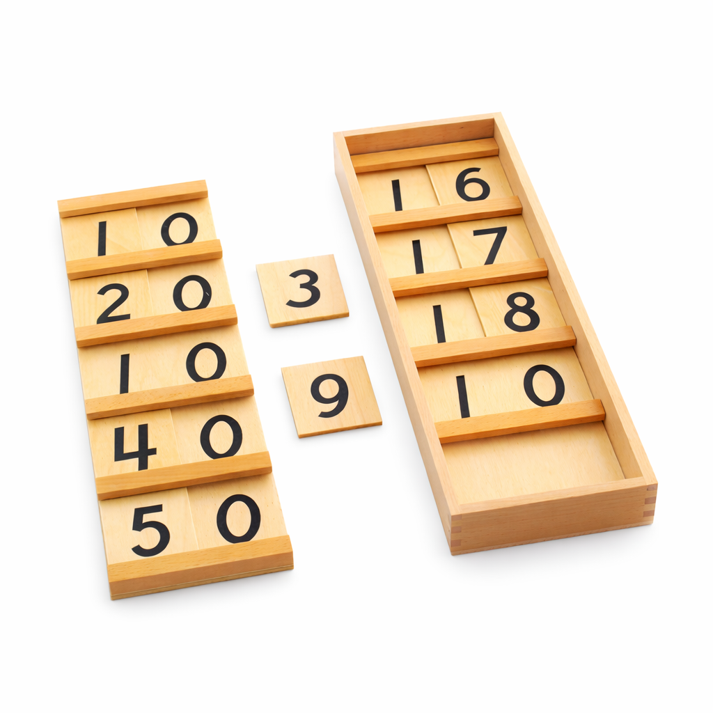 The Teen Board uses the knowledge of the bead stair to introduce the quantities and vocabulary of numbers 11-19 A wooden box with lid containing 2 teen boards (teaching 11-19) and 9 wooden cards with the numerals 1-9 printed in cursive.